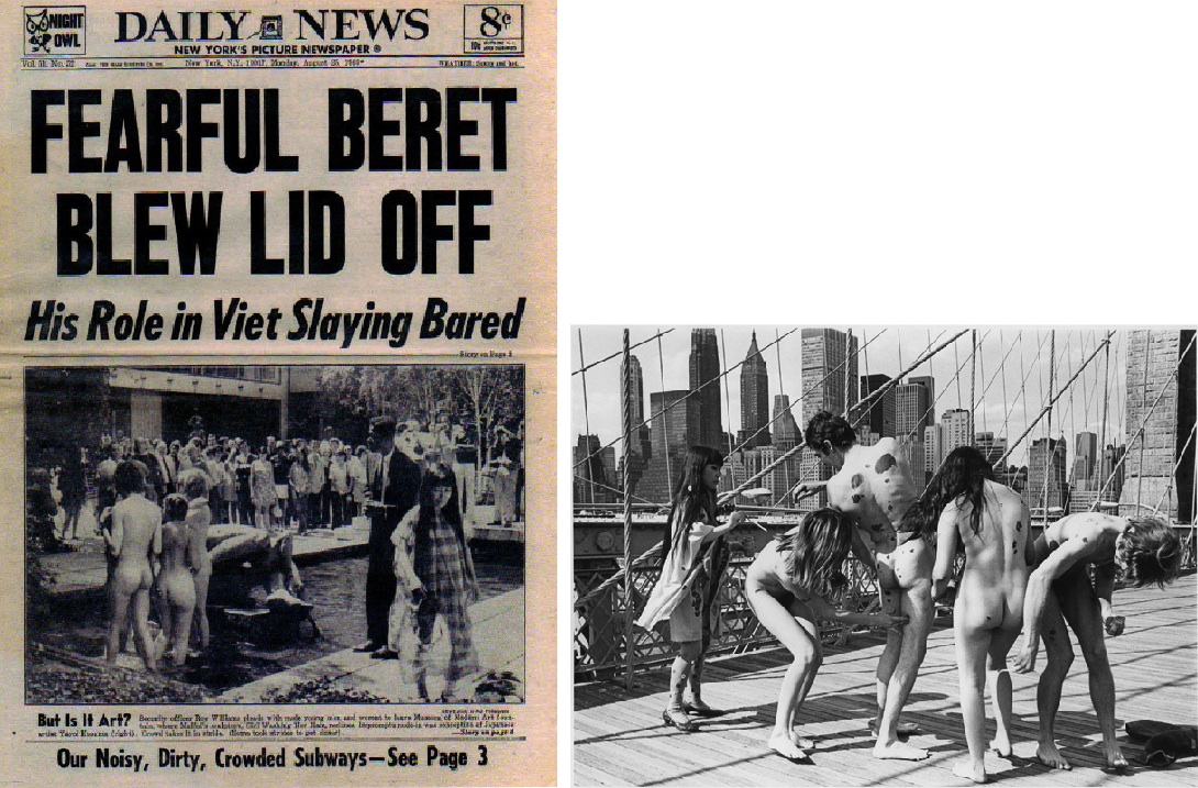 Yayoi Kusama performances. Izq. portada del Daily News, agosto de 1969, “Grand Orgy to Awaken the Dead” en el MoMA. Dch. Anatomic Explosion, Puente de Brooklyn, NY, 1968 / Photos. I: Daily News. Dch: Shunk-Kender © Roy Lichtenstein Foundation